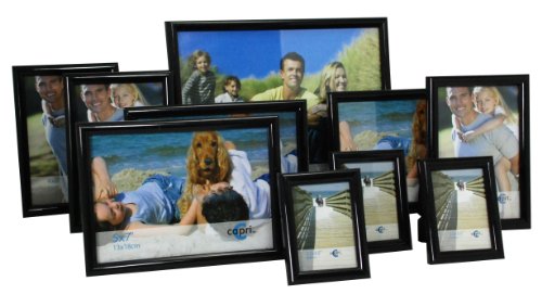 Detail of Capri 10-Piece Nuvo Frame Set, BlackCreate a classic gallery of your favourite photographs and artwork with this 10 piece Nuvo frame set. These contemporay frames are perfect for the wall or tabletop and have a black satin finish. Includes one 8-Inch by 10-Inch, three 5-Inch by 7-Inch , three 4-Inch by 6-Inch and three 2.5-Inch by 3.5-Inch frames in the boxed set. Ideas for displaying and/or hanging the collection are detailed on the packaging. This set is perfect for home, office or a stunning gift.